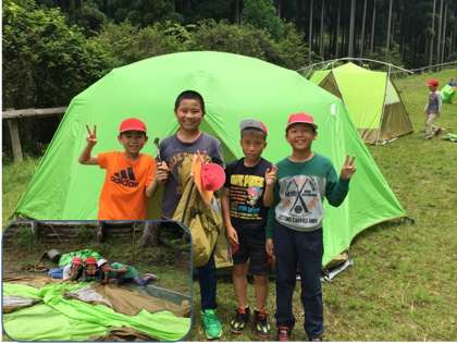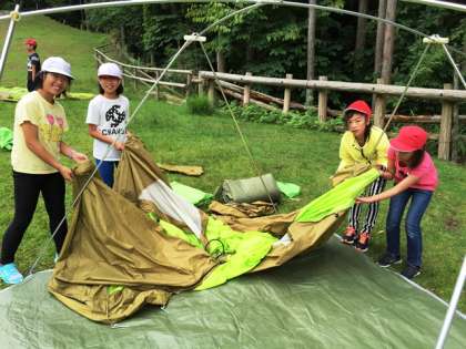 いよいよテント設営を自分たちで行いました。まずは,場所を決めてから骨組みを始めます。しっかり説明を聞いていたので,うまくできているとほめていただきました。このまま雨が落ちて来ないのを祈るばかりです。