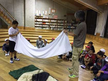 予想以上に天気が良くなってきました。この調子だとテントで寝ることができそうです。みんなワクワクです。さっそく,シュラフの使い方を教わりました。