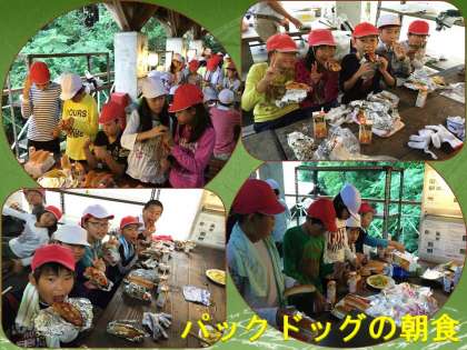 気持ちのよい朝を迎えました。上鳥羽より涼しく,心地よい朝です。野外活動2日目のスタートです。まずは,野外炊事で朝食作りから始めます。牛乳パックを使ってホットドッグを作ります。おいしい「パックドッグ」のできあがり。「いただきます!」