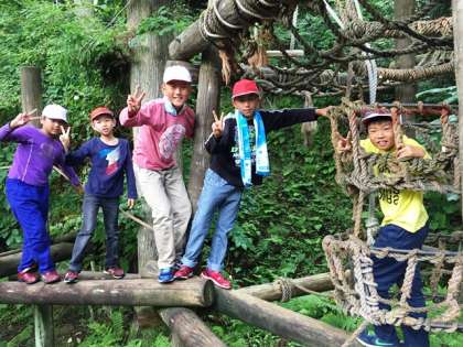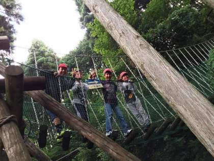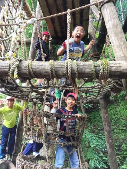 朝のひととき,山のおいしい空気をいただきながら冒険の森にレッツゴー。ちょっぴりスリルあるフィールドアスレチックにチャレンジです。