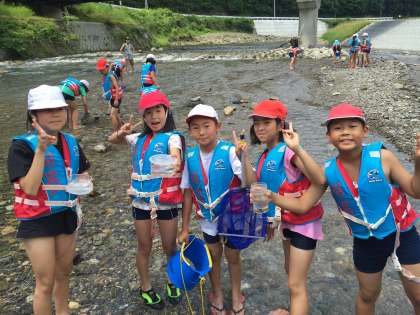 夏を思わせるような日差しの中,みんなは交流の森の河原で水の生物の採集をしています。