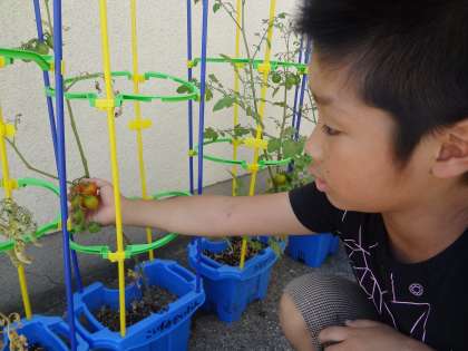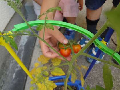トマトがちらほら赤くなり,収穫して帰る子が増えています。
