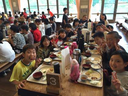 今日の夕食が最後となる花背山の家。しっかり活動し,モリモリ食べる5年生です。