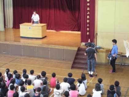 上鳥羽小学校は,今日,8月22日(月)から前期後半が始まりました。京都市では一番早く始まる学校ということで,京都新聞,KBS京都,NHK京都放送局の取材がありました。朝会では,体育館にテレビカメラやマイクが設置され,子どもたちはいつもと違う雰囲気に少し緊張ぎみでした。朝会の後は,教室の子どもたちの様子を見て回られました。