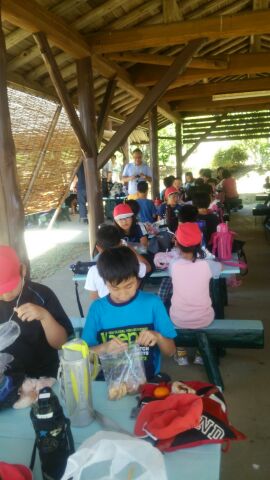 待ちに待った昼食タイム。朝早くから,お弁当の準備をしていただきましてありがとうございます。みんなおなかペコペコでしょう,いっぱい食べてくださいね。