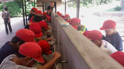 お米を洗っています。集団で洗う様子は少し面白く感じてしまいました。