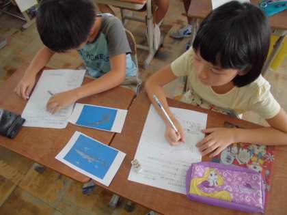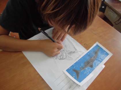 ジンベエザメを写真で見ながら,丁寧に描いています。