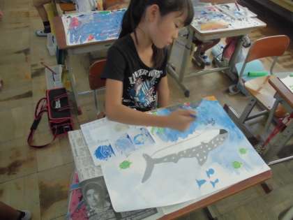 「ジンベエザメのはこびかた」という本を聞いて,絵を描きました。