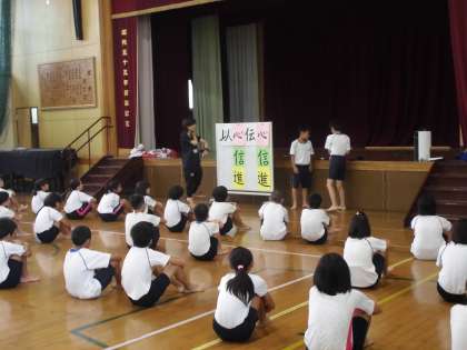 今日から6年生と組体操の練習がはじまりました。今年のテーマは,「以心伝心」です。運動会に向けて,5・6年生が心を一つにできるようがんばります。