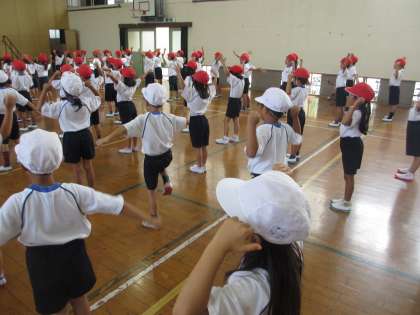指先までをしっかり伸ばし,大きな演技を心がけます。