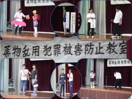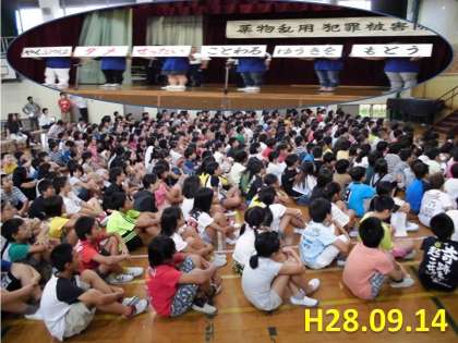 14日(水)の自由参観日に5時間目を全校「薬物乱用防止・犯罪被害防止教室」として体育館で学ぶ機会を設けました。京都府警南警察署及び地域少年補導委員会との合同事業として実施した本学習会では,府の関係者や保護者の皆さんにもご参観いただきました。低学年にも分かりやすくと寸劇で構成し,大切なやくそく「いか・の・お・す・し」と「薬物はゼッタイ ダメ! 断る勇気をもとう」を全員で唱えました。