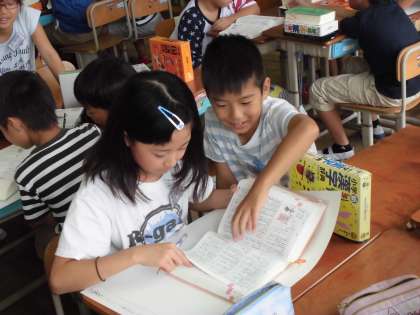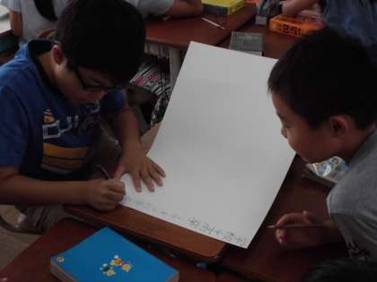 昨日学習した漢字しりとりのルールを使って,グループで順番に回して漢字しりとり大会をしました。どの班が一番多くつなげたかな。
