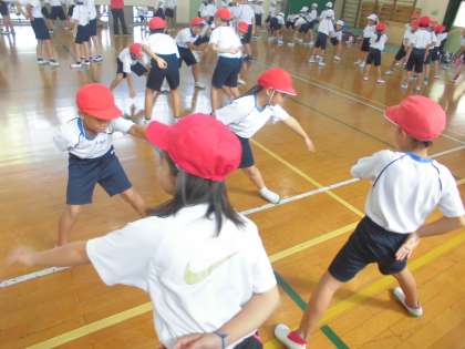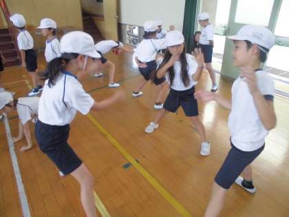 運動会のたてわりのグループが同じ4年生にダンスの振り付けを教えてもらいながら,練習しています。曲のテンポが速く,ついていくのが難しそうですが,4年生の背中を見ながら頑張っています。