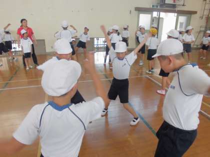 運動会のたてわりのグループが同じ4年生にダンスの振り付けを教えてもらいながら,練習しています。曲のテンポが速く,ついていくのが難しそうですが,4年生の背中を見ながら頑張っています。