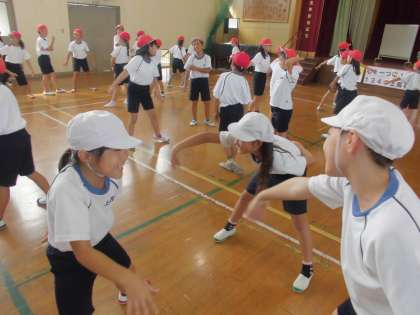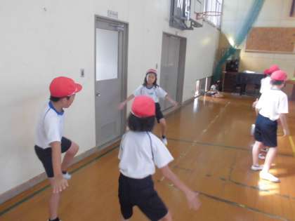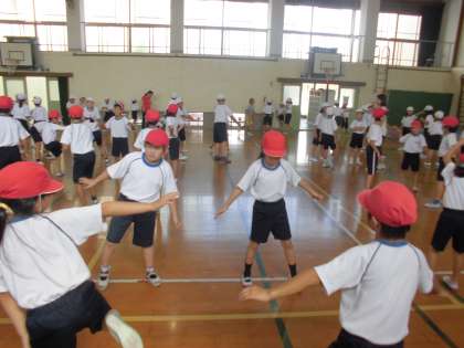 運動会のたてわりのグループが同じ4年生にダンスの振り付けを教えてもらいながら,練習しています。曲のテンポが速く,ついていくのが難しそうですが,4年生の背中を見ながら頑張っています。