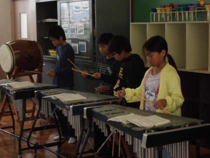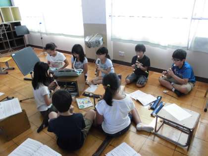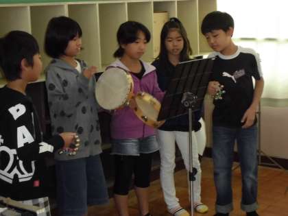 A リコーダーと鍵盤ハーモニカ B リコーダーと鉄琴 C 木琴 D すずとタンブリン E 小太鼓とウッドブロックとマラカス,カウベルなど F ピアノとオルガン に分かれて,演奏します。それぞれのパートで練習をしています。