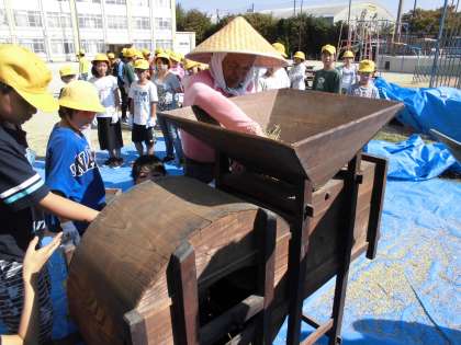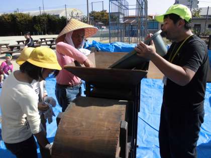 次は,唐箕を使います。唐箕(とうみ)とは,風力を起して穀物を選別するための農具です。くるくるとレバーを回していきます。