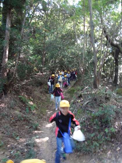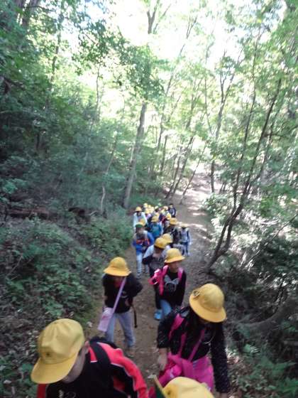 道路と違って,傾斜や石がある山道では,気持ちが高まる様子で,きゃいきゃい言いながら登りも下りも楽しそうに歩く子がたくさんいました。すれ違う人たちに元気にあいさつができている子もいました。