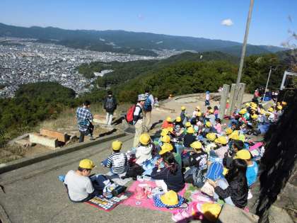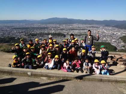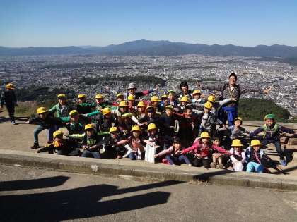 頂上で記念撮影をしました。空気が澄んでいて京都市内が一望できました。