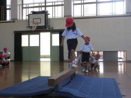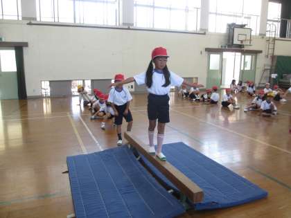 体育では持久走大会の練習と平行して,平均台あそびを進めています。