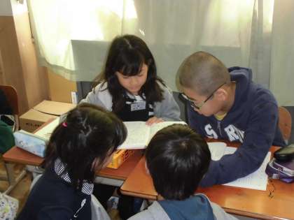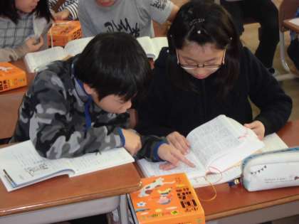 辞書を使って調べてみよう!!友達と一緒に調べています。