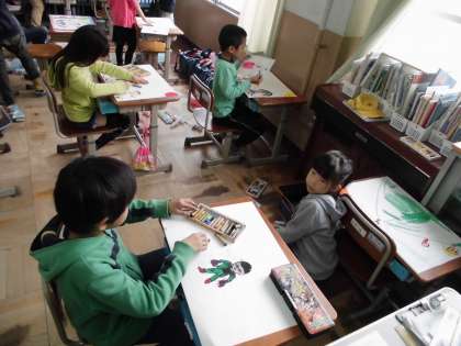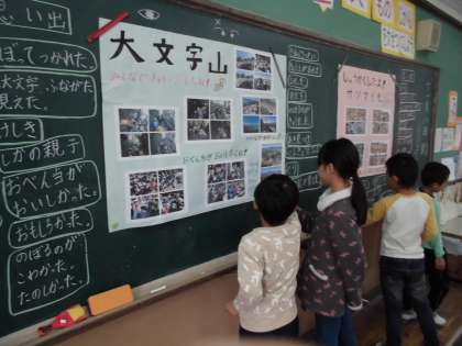 「大文字山遠足」と「さつまいものしゅうかく」のどちらかを選んで絵に表現しました。思い出を発表する場面でもたくさんの発表がありました。