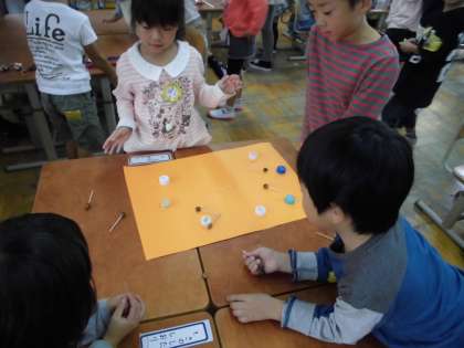 参観日の生活科では,秋みつけで拾った,どんぐりや松ぼっくりを使って秋祭りをしました。