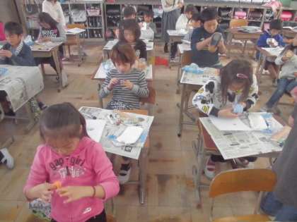 お家から持ってきていただいた空き容器を使って,小物入れを作りました。思い思いに粘土を貼り付けて世界に一つだけの小物入れを作ることができていました。空き容器を持ってきていただきありがとうございました。