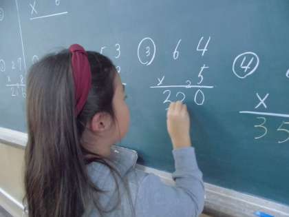 算数では,1けたをかけるかけ算の筆算の学習が始まっています。自分の考えをみんなの前で上手に説明しようと工夫している姿が見られます。