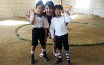 世界大会銀メダリストの山中未久選手と相撲をしたり写真を撮っ