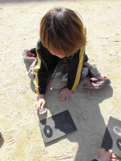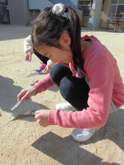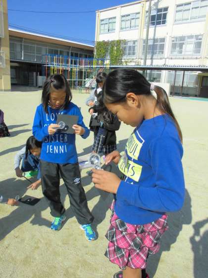 理科の学習で,太陽の光を鏡で反射させ光を当てたところのあかるさやあたたかさを調べたり,虫めがねを使って光を集めるとどのようになるのか実験して調べました。