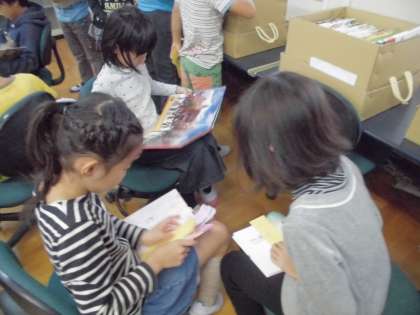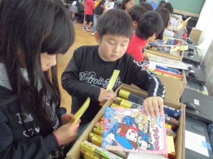 5時間目に,1組2組のみんなで図書室に置いてほしい本を選びに行きました。本を読むことが大好きな子どもたちは,たくさんある本にワクワクしながら楽しそうな様子でした。