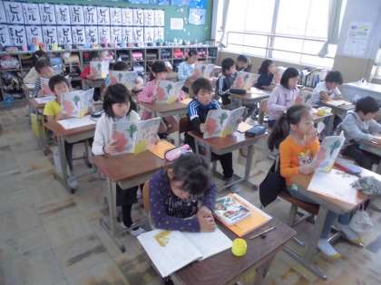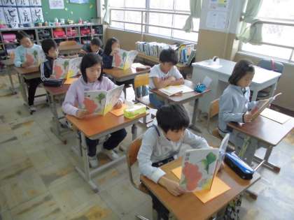 学習を始めたころから,このお話が大好きな子どもたちは,国語の時間になると「。読みしたい。」と話したり,リズムよく読むところが好きで,暗記して言っていたりと意欲的に学習している姿がありました。最後の学習では,自分が読み進めてきた昔話や民話をグループの友だちに紹介しました。