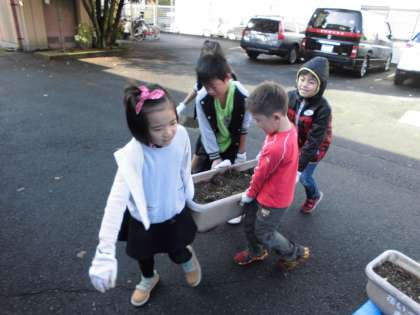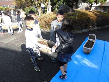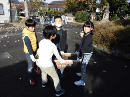 今日は,美化活動がありました。プランターの土を新しく変えるため,力を合わせて運びました。