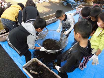 説明を聞いた後,古い土をふるいにかけて,根や葉などを取り除きました。