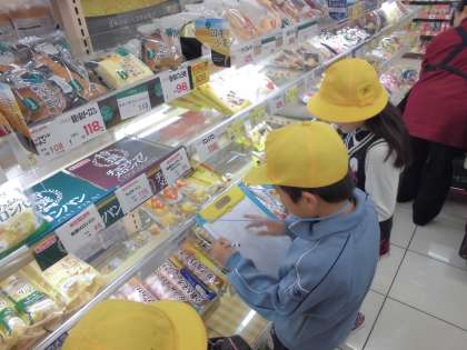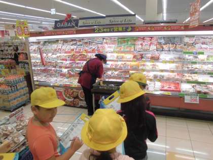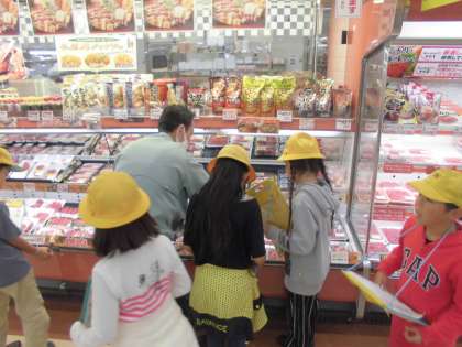 社会「商店のはたらき」の学習で,スーパーマツモトへ社会見学に行ってきました。たくさんのお客さんに来てもらうために,店はどのような工夫をしているのか考えたり,普段は見ることができない店の裏側の様子も見学させてもらったりすることができました。