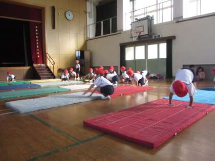 川とび,ゆりかごなどといった,マット運動の基礎となる技を練習しています。