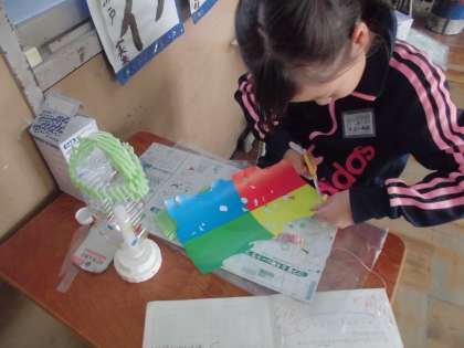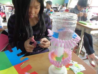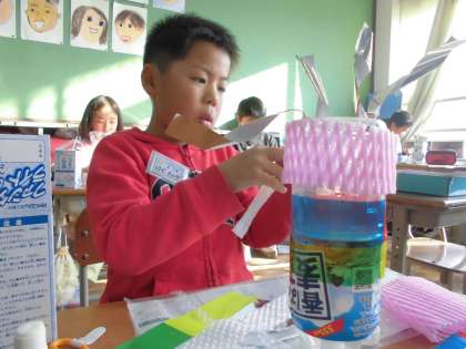 空きペットボトルを使って,光るオブジェを作りました。光を当てるとどのように作品が映し出されるのか楽しみです。