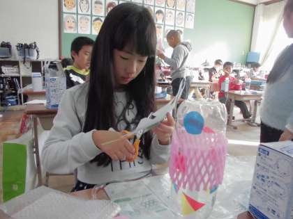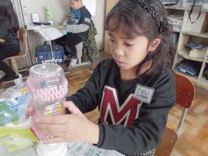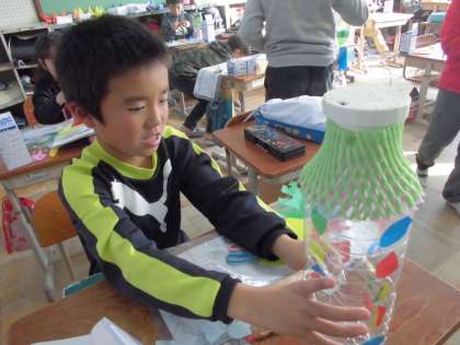 空きペットボトルを使って,光るオブジェを作りました。光を当てるとどのように作品が映し出されるのか楽しみです。
