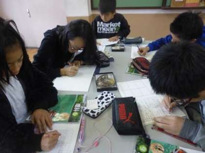 化石の観察をしています。化石をルーペで観察し,細かいところまでしっかりノートにかけています。