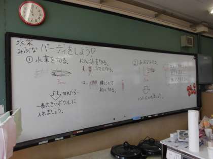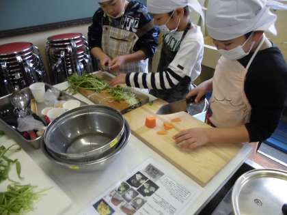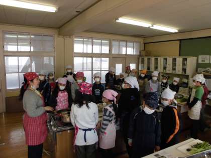 エプロン・三角巾・マスクをして調理の準備が整いました。初めに,作り方を栄養教諭の鎌田先生から教えていただきました。いよいよ調理開始です!!