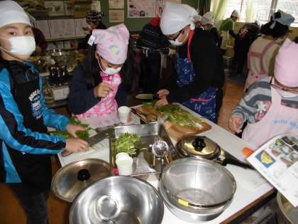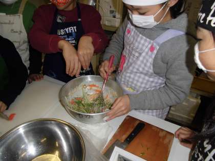 コンロを使って,チヂミを焼いたり,壬生菜をゆがいたりしました。