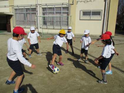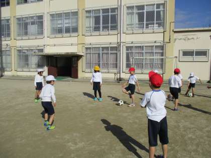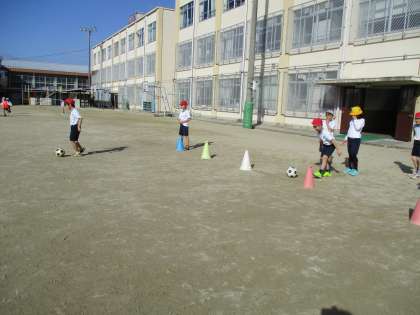 1時間目は,ボールをけることに慣れるため,ドリブルやシュートの練習や,ボールをとられないようにパスをする鳥かごをしました。子どもたちはとても楽しんで,その日の放課後に「先生!鳥かごしよう!」と言ってくる子もいました。