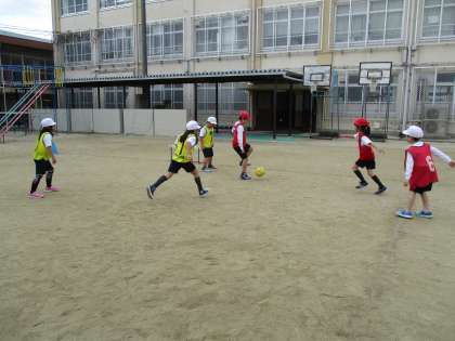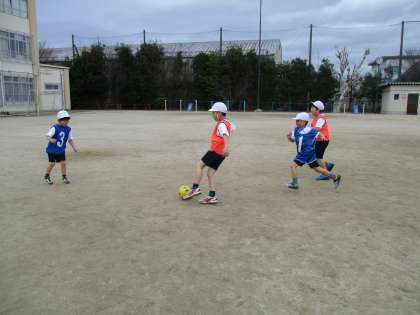 チーム対抗のゲームが始まりました。パスゲームで学んだことを生かして,うまく味方にパスをしたり,ボールを敵からとったりしようとする子がいました。