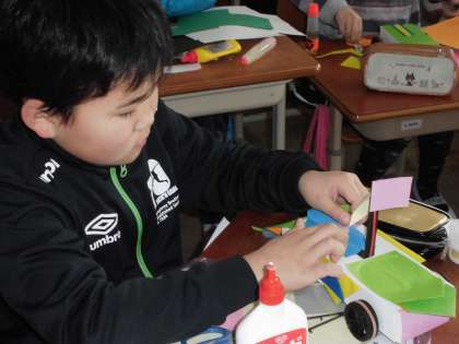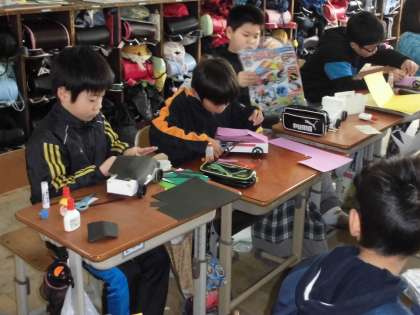 真剣に飾りを考えてつくっています。ゴムで動く仕組みなので,自分の作ったドリームカーが走る日が楽しみにがんばっています。