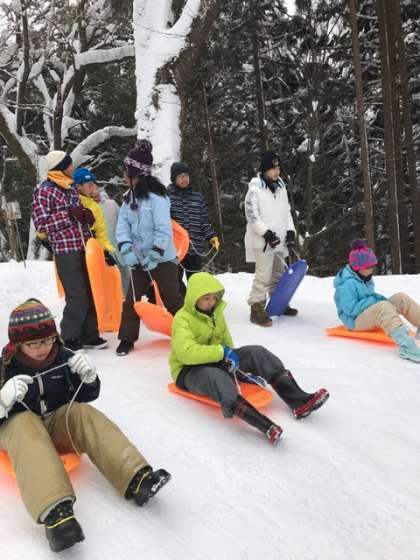 雪山を満喫しています。みんなで,そり遊びをしています。