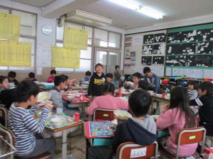 17日(金)のきらきら学習発表会の後の給食では,机をみんな教室の真ん中の方を向けて食べました。そして,一人ずつ真ん中へ立ち,感想を言いました。