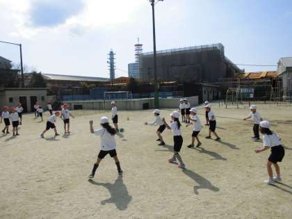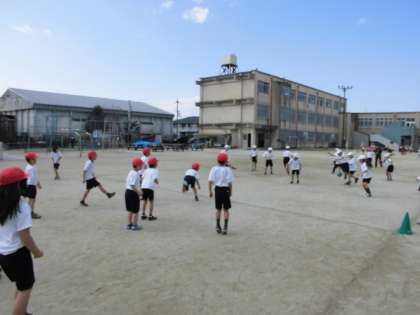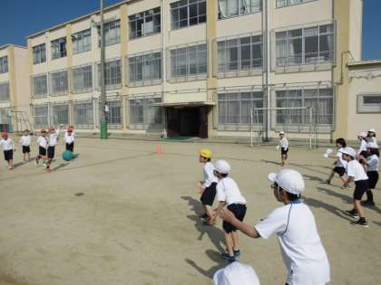 1組・2組合同で体育をしました。ドッジボールをして楽しみました。