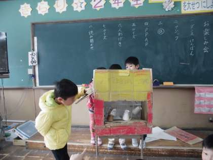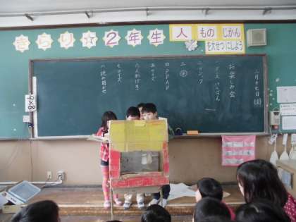 「2年2組のいつも」という人形劇です。人形も子どもたちの手作りです。大文字山遠足を人形劇にしていました。クオリティーが高く,人形の動きにみんな釘づけでした。
