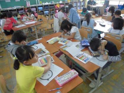 みんなで育てる ひまわり・おじぎそう・ふうせんかずらの種を観察しました。それぞれ大きさや色,模様がちがいました。